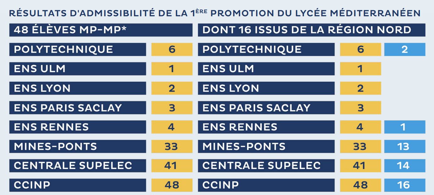 Les résultats de nos 16 élèves issus du Nord ont également permis à la région de se positionner comme un pôle d’excellence. Parmi ces derniers, 2 sont admissibles à l’École Polytechnique (X), 1 à l’ENS Rennes, 13 admissibles au Concours Commun Mines-Ponts et 14 au Concours Centrale-Supélec.